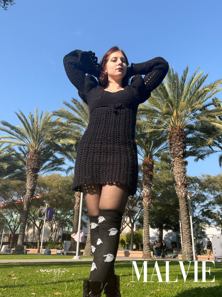 My beginnings started with plushies for my boyfriend, which admittedly aren’t the most beginner-friendly projects (thick yarn, new language of written patterns, etc.), but I took on the challenge. Making clothing afterwards was like a piece of cake! After making more and more, I wanted to see how I could translate this technique into wearable art, sharing whimsical and gothic elements with either structured or more delicate garments.